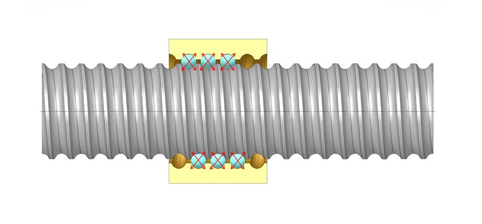Einzelmuttern werden durch Kugelübermaß vorgespannt. Es ergibt sich ein 4-Punkt-Kontakt der Kugeln. Dadurch unterscheidet sich diese Art von Mutter grundsätzlich von allen anderen. Dies beeinflusst verschiedene technische Daten.
